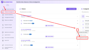 Pour supprimer une classe, allez dans Edudirection / Classes et enseignants. Repérez la classe à supprimer et cliquez sur les trois points verticaux en haut à droite de la carte de la classe. Choisissez « Supprimer la classe ».