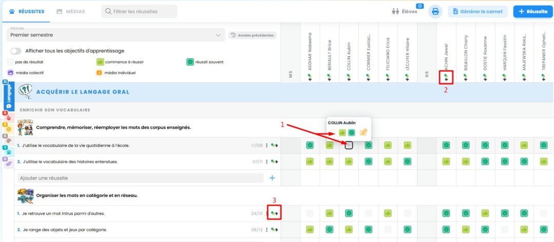 (2), vous pouvez mettre le même résultat pour toutes les réussites d’un élève. En cliquant sur l’icône