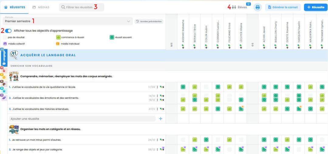 - En affichant ou non tous les objectifs d’apprentissage (2). Si l’option est désactivée, seuls les objectifs d’apprentissage avec des réussites saisies apparaissent. Les domaines non renseignés sont grisés et ne sont pas cliquables.