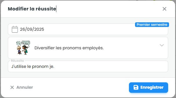 Vous pouvez modifier la date et/ou la période de la réussite, l’objectif d’apprentissage ou le texte de la réussite en cliquant dessus. Une fois les modifications effectuées, cliquez sur Enregistrer.