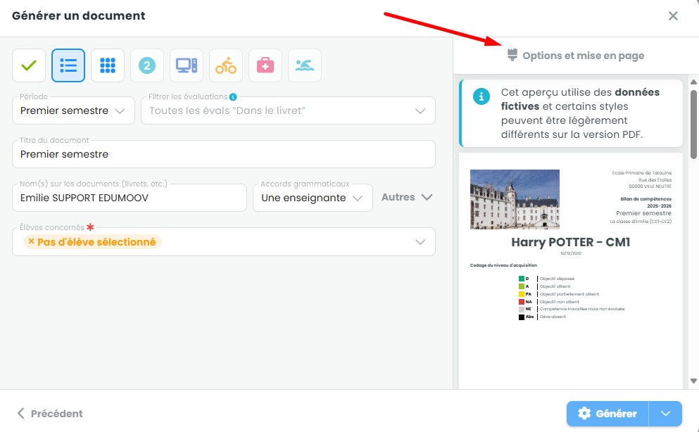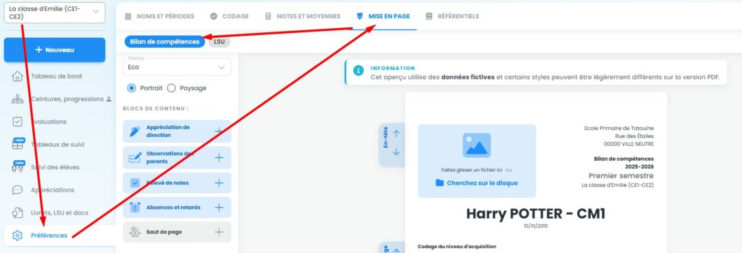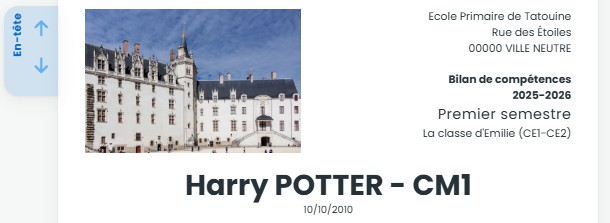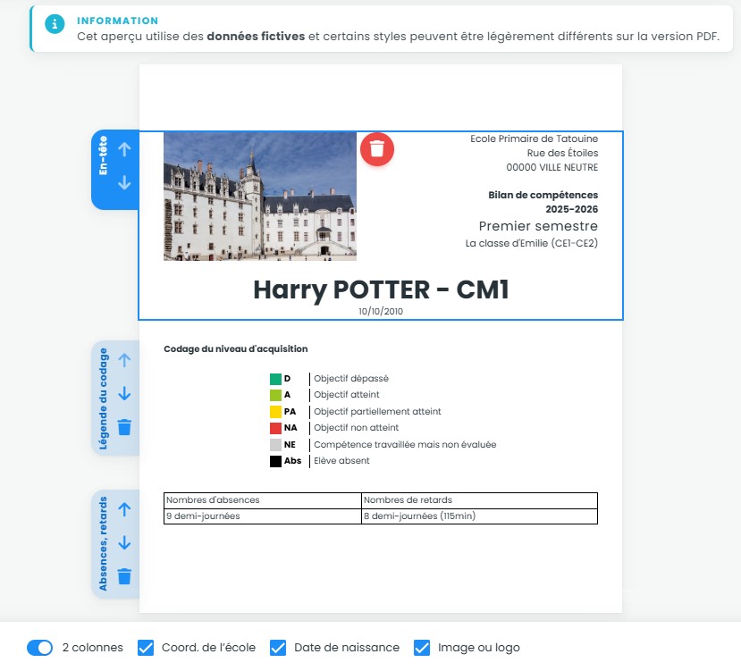 2. L’affichage des coordonnées de l’école et la date de naissance de l’élève sont facultatifs. Les données de l’école ou de la classe sont modifiables dans Edudirection ou Educlasse.