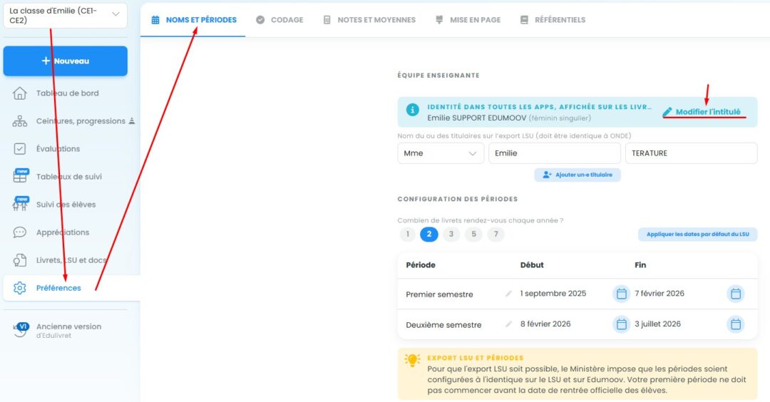 Vous pouvez gérer les noms des enseignants dans les Préférences, au niveau de l’onglet Noms et périodes :