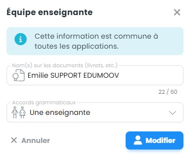Ce sont les noms qui apparaissent dans toutes les applications et sur les différents livrets et documents. Les accords grammaticaux ont un impact sur certains affichages sur les livrets.