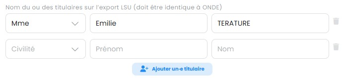 Concernant les LSU, vous pouvez ajouter un·e titulaire : les deux noms seront pris en charge lors de l’export. Ces noms doivent être le même que sur ONDE pour éviter l’alerte Enseignant inconnu lors de l’export.