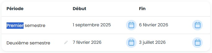 Vous pouvez gérer le nombre, le nom et les dates de début et fin de vos périodes d’évaluation.