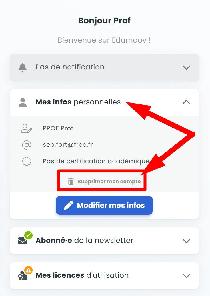 En cas de suppression de votre compte, la ou les classes associées ne seront pas supprimées et resteront accessibles aux autres enseignants de celles-ci. Si vous en êtes le seul enseignant, ces classes ne seront plus accessibles et seront supprimées automatiquement au bout d’un an.